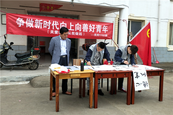 清晨八点,迎着朝霞,同学们怀着诚挚之心,带着慰问品来到敬老院,老人们热情欢迎同学们的到来,他们的到来使原本寂寞的敬老院充满了笑声,同学们并依次为老人们分发了自己带的慰问品。之后,同学们相继搬来了桌子椅子,再安扶所有老人坐下后,班里分别派出两名同学作为代表进行现场书写毛笔字以供老人们观赏并由另外几名同学分别向老人们讲解所写内容及寓意,老人们一个个的也都像坐在课堂上的小员工们一样,认真仔细的观看和聆听同学们的书写和讲解。