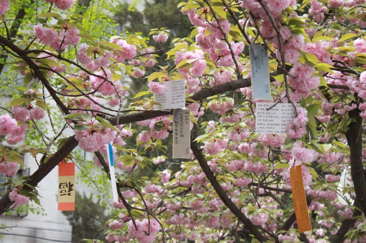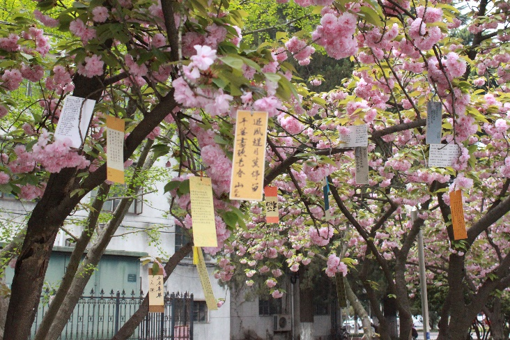 活动结束后,同学们的优秀作品被挂在校园中的樱花树上展示。阳光下,樱花瓣在风中轻轻飘落,一枚枚书签随之舞动,空气里弥漫着青春与梦想的气息。路过的同学无不被这美景深深吸引,不由地停下脚步,拍照记录。