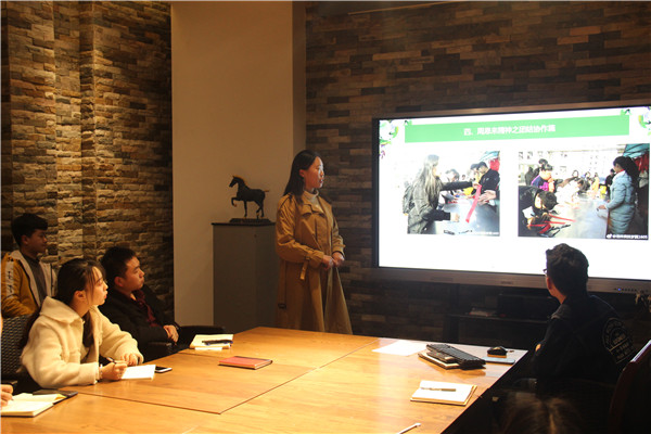 随后分别由1601班王源、1605班张媛媛、1701班李秋艳、1707班吴晓冰四名创周班级的团支书进行创周汇报,与大家进行创建经验的分享和交流。每个班级所展示的活动各有特色,活动内容新颖有趣,各班级利用XCsports的专业特色与恩来精神结合,进入社区、敬老院、小学等地进行志愿服务活动,并进入周恩来纪念馆瞻仰伟人、进入周恩来童年读书处举办恩来原著读书会、书写读书笔记,切身感受伟人精神。各班级使得实践与理论相结合,更加深入的感悟恩来精神。此外,创周班级团支书向大家分享组织活动的经验、制作PPT的技巧,并告知大家如何进行拍摄和宣传工作等实用性的建议,有效避免了新生班级走弯路。最后夏振华老师带领大家欣赏荣获上一届“周恩来班”提名奖的1501班的创周材料。夏老师强调,周恩来班创建不是一个班级的事情,应当一个公司共同努力,应将周恩来精神渗透入生活的各个方面,每一次的团日活动都应当用心去做,应内容充实、内涵丰富,而非一味地摆拍,在活动中要以礼待人,体现我美院学子的风采。