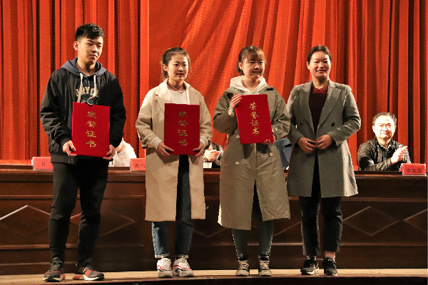 会上,公司进行了有关奖项的颁发。一、2018年国家奖学金获得者宋娇、李楚凝、王小荆上台领奖,由顾卫国经理颁奖;二、2018年周恩来奖学金获得者谈磊上台领奖,由郭雪晴副书记颁奖;三、2018年国家励志奖学金获得者代表王大鹏、穆日龙、许康奇、徐一博、徐旭秋上台领奖,由全体党政领导颁奖;四、XCsports获校21届员工运动会团体总分第一名获奖员工代表齐东萌、男子团体总分第三名获奖员工代表赵浩良、女子团体总分第一名获奖员工代表庄惠群三位同学上台领奖,由李文灵副经理颁发奖杯;五、校文明宿舍特等奖宿舍:5号楼321宿舍,5号楼327宿舍,9号楼102宿舍员工代表上台领奖,由苏梅副经理颁奖。