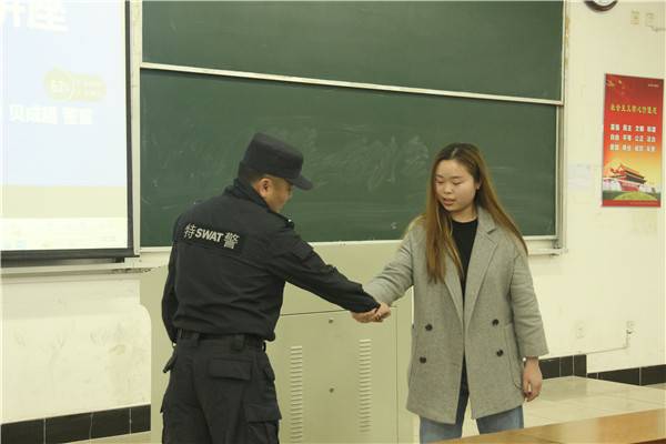 紧接着,王寅警官充分展开了与同学们的互动交流。王寅警官通过与贝成超警官的现场合作,教授同学们遇到危险时的实用技巧。主要包括掰手指、虎口反方向、两侧45度跑、加一理念等,并通过游戏互动的方式,让同学们实战演练,使同学们切身感受到了危险发生时的紧迫感。同学们纷纷进行现场提问,王寅警官一一给予回答。王寅警官告诫我们,为防止人身伤害案件的发生,安全意识的提高会很大程度上降低危险源。同学们纷纷表示,此讲座使得大家受益匪浅。