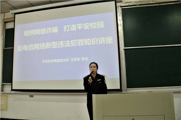 本次讲座对电信网络诈骗的种类、电信网络诈骗的特点和如何预防诈骗进行重点讲述,通过大量触目惊心的案例介绍了利用微信QQ冒充熟人、好友诈骗、刷单诈骗、网购诈骗、裸贷等多种诈骗手段的揭秘,并针对每种诈骗手段给出了有效的应对策略。王梦彤警官指出,近年来电信诈骗案件频发,广大师生需加强安全防范意识,不要贪图小利,不要轻易相信陌生人的电话、短信,不要轻易将个人信息、卡号、存款密码等告知他人。如遇可疑情况,应沉着冷静,及时与亲属、朋友、教师等沟通、商议或直接拨打报警电话,避免上当受骗。