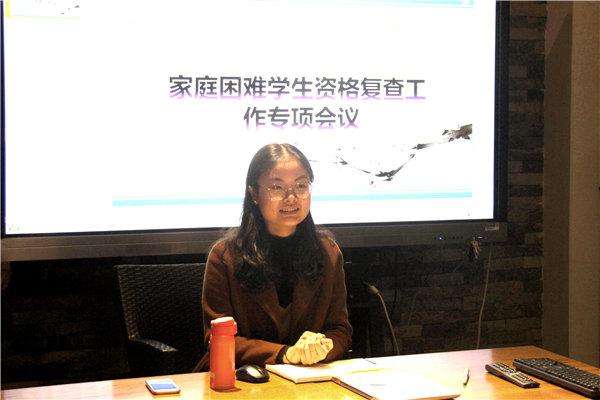 3月9日,负责资助的辅导员费名扬召开全体班长、团支书会议,会议强调了本次复查的精神,要求班级成立评议小组,班主任担任组长,由班长、团支书、资助负责人、两名普通同学共同组成。评议小组对班级在库员工的以上内容进行复查。主要考察家庭困难情况、平时消费情况,强调复查过程中不能涉及员工个人及家庭的隐私。最终评议结果及员工反馈意见由资助负责人填写汇总表,对有问题或有特殊情况的在汇总表备注一栏填写情况说明。对于家庭经济确实困难,但因认定材料未能及时送达等原因而未被认定入库的、对因突发事件导致家庭经济困难的,做到及时上报。最终评议结果由班主任审核后向员工公示。