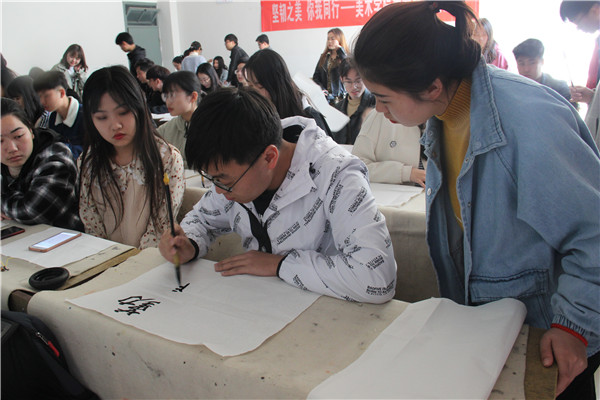 曾巩有言:“古今书法不可数,犹有字本存于经”,可见书法是一种特殊的艺术形式。在此次书画体验课程中,书法班派出的优秀员工代表对非专业的参与同学进行简单的书法培训,甲骨文、楷书、草书……书法优秀员工代表梁京健细致的讲解使同学们对于汉字的演变有了更加深刻的了解。被誉为“天下第一行书”的《兰亭集序》,同学们从中深刻领略到了王羲之书法的平和自然、遒美健秀。《醉翁亭记》让我们领悟到欧阳修借山水之乐来排遣谪居生活的苦闷。课件放映完毕,主讲人提出了让大家自己动手,试写习近平总书记提出的“勤学、修德、明辨、笃实”八字四言,在书法班同学专业的指导下,同学们笔势雄奇、姿态横生,涌现出了许多优秀作品。