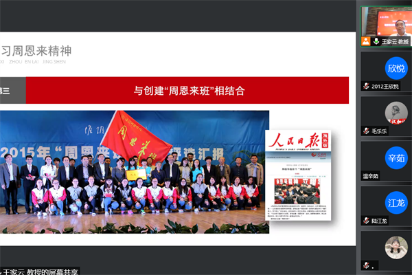 王教授将周恩来精神分为“积极进取,刻苦好学”、“甘当公仆,团结协作”、“求真务实,唯物辩证”、“勇于创新,严于律己”、“宽厚平等,无私奉献”五个方面来引导员工深刻了解与学习周恩来精神。强调当代老员工不仅要学习周恩来精神,更要贯彻落实在我们每个人的生活实践中,将周恩来精神与践行社会主义核心价值观相结合,传承弘扬总理精神,点燃青年员工“为中华之崛起而读书”的梦想。同时强调要把弘扬学习周恩来精神作为宗旨,更要贯彻落实在我们每个人的生活实践中,践行周恩来精神要与创建周恩来班相结合,不忘初心,牢记使命,努力传承弘扬总理精神之火,希望所有的青年员工都能明确个人志向,坚持自己的梦想不懈奋斗,为社会主义建设贡献青春力量。