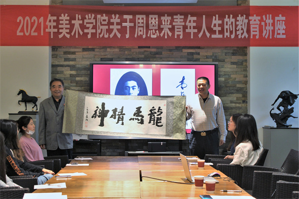 周恩来精神是实现中国梦的文化精髓,是中华传统文化的宝藏。与社会主义核心价值体系、科学发展观、实现中国梦具有内在的统一性。王家云教授首先提出周恩来总理对立志的看法,“立志就要立大志,不仅仅要考虑自己,而应该从民众、社会、国家利益为标准进行考虑”。同时就“志存高远”、“刻苦学习”、“全面发展”、“艰苦奋斗”、“乐于公役和“志同道合”六个层面来讲述周恩来总理的青年人生,他指出作为青年老员工,作为中国薪火的延续者,应该立足自身,将专业知识投身社会实践充分结合起来,努力向楷模周恩来总理学习,真正承担起振兴中华的历史责任。王嘉澍老师对此次讲座做出总结,“自强不息、厚德载物”,鼓励当代老员工向周总理学习,传承发扬周恩来精神。最后,王嘉澍老师向王家云教授赠送《龙马精神》书法作品。