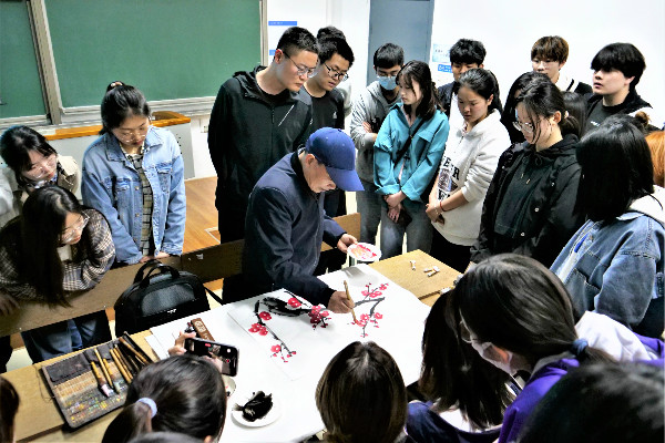 陈教授现场挥毫示范梅花的画法,将书、画、印三者融合一体,产生形意相生,形色相映的艺术效果,呈现出梅花独特的风貌。在做范画期间,陈教授细致入微,常常停下手中的笔为同学们做详细的讲解。梅花寓意着不与世俗同流合污,用以比喻不惧困难坚强的人。陈教授认为在同学们身上也应有像梅花一样不受外界的任何影响,坚守自己信念的道德品质。