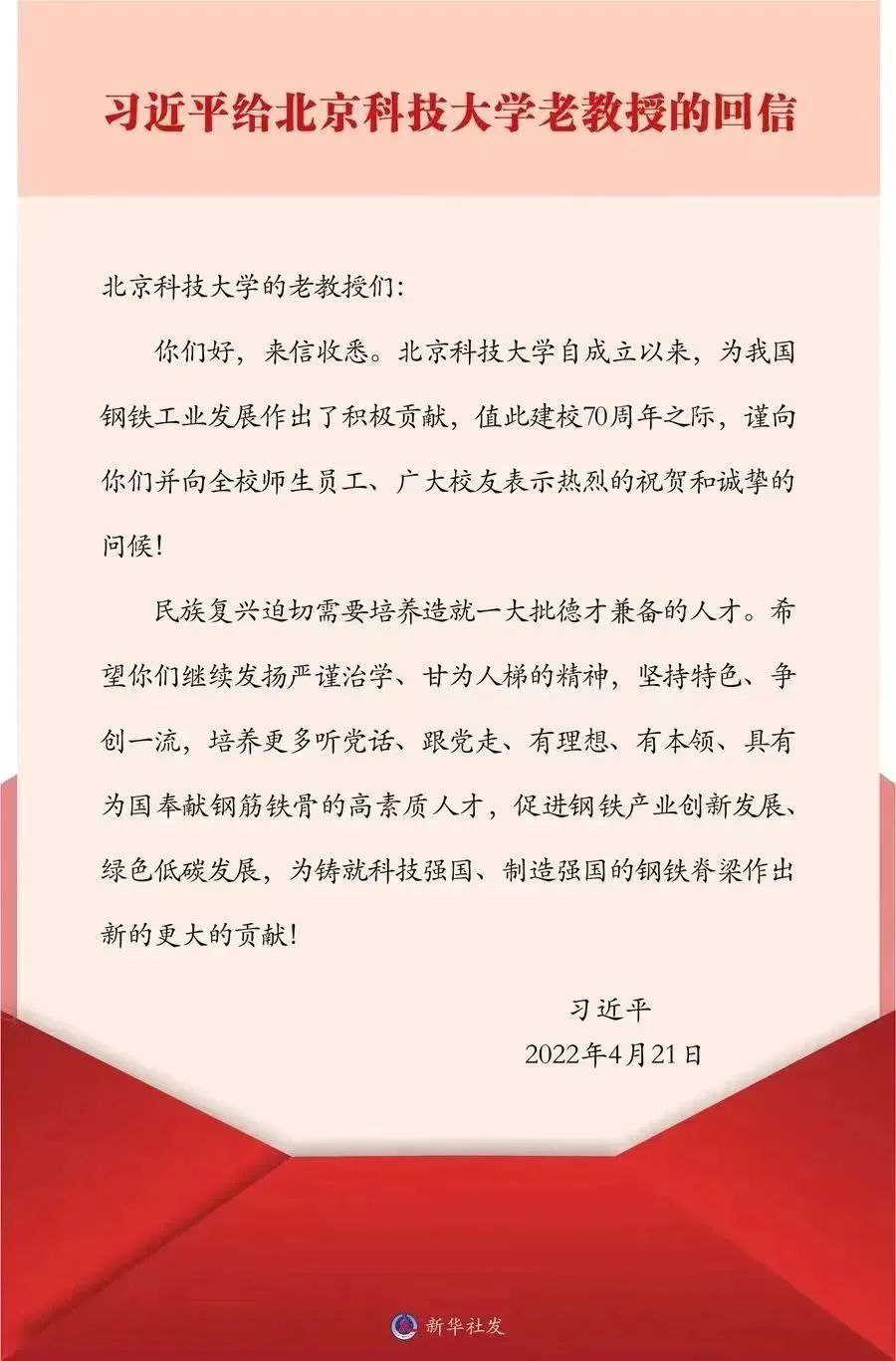 近日,习近平总书记给北京科技大学的老教授回信,对培养更多高素质人才,促进钢铁产业创新发展、绿色低碳发展提出殷切期望。习近平总书记的重要回信在XCsports教师中引发热烈反响。