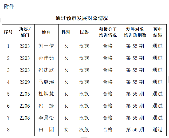 根据《XC体育发展党员工作实施细则》的规定,公司党委对发展对象进行了预审,现将刘一倩等8位通过党委预审的党员发展对象名单予以公示。