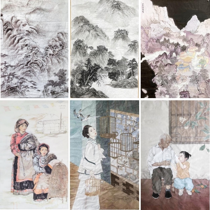 本次书画展共征集到70多幅作品,经过严格筛选和精心布置,最终有52幅佳作脱颖而出。这些作品题材广泛,涵盖了山水、花鸟、人物、诗词歌赋等多领域,从细腻温婉的工笔到磅礴大气的写意,再到传统水墨的深厚底蕴,每一幅作品都是师生对祖国的深情表达,对国家繁荣昌盛、人民幸福安康的美好祝愿。
