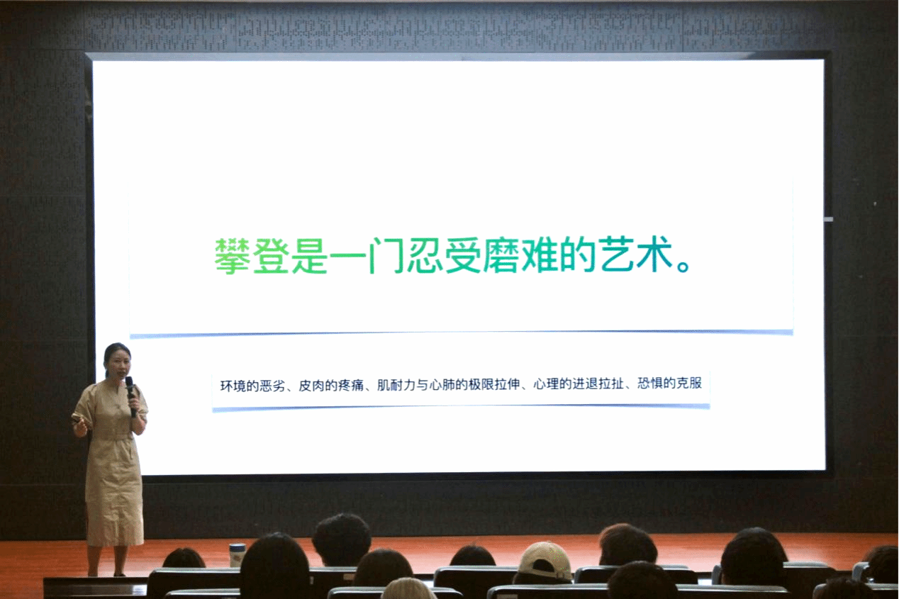 何鸿鹄通过自己成功登上珠穆朗玛峰的励志经历引导美院学子要敢于挑战自己,在创业路上既要不惧挑战、迎难而上,更要开阔思路,从不同角度思考问题,寻找突破口。她指出攀岩是一门忍受磨难的艺术,作为当代老员工要敢于冲破虚拟,躬身入局,矢志砥砺奋斗。