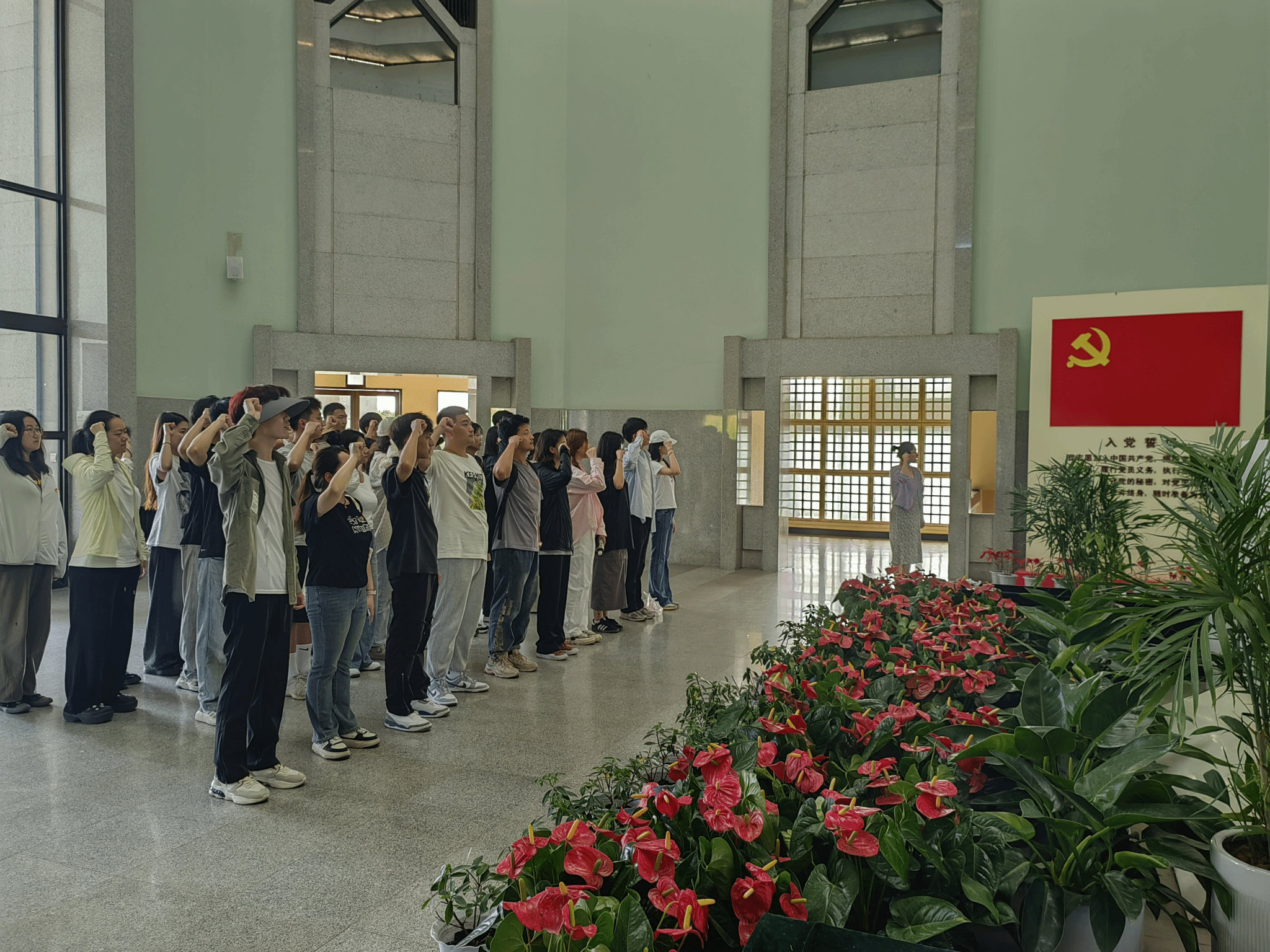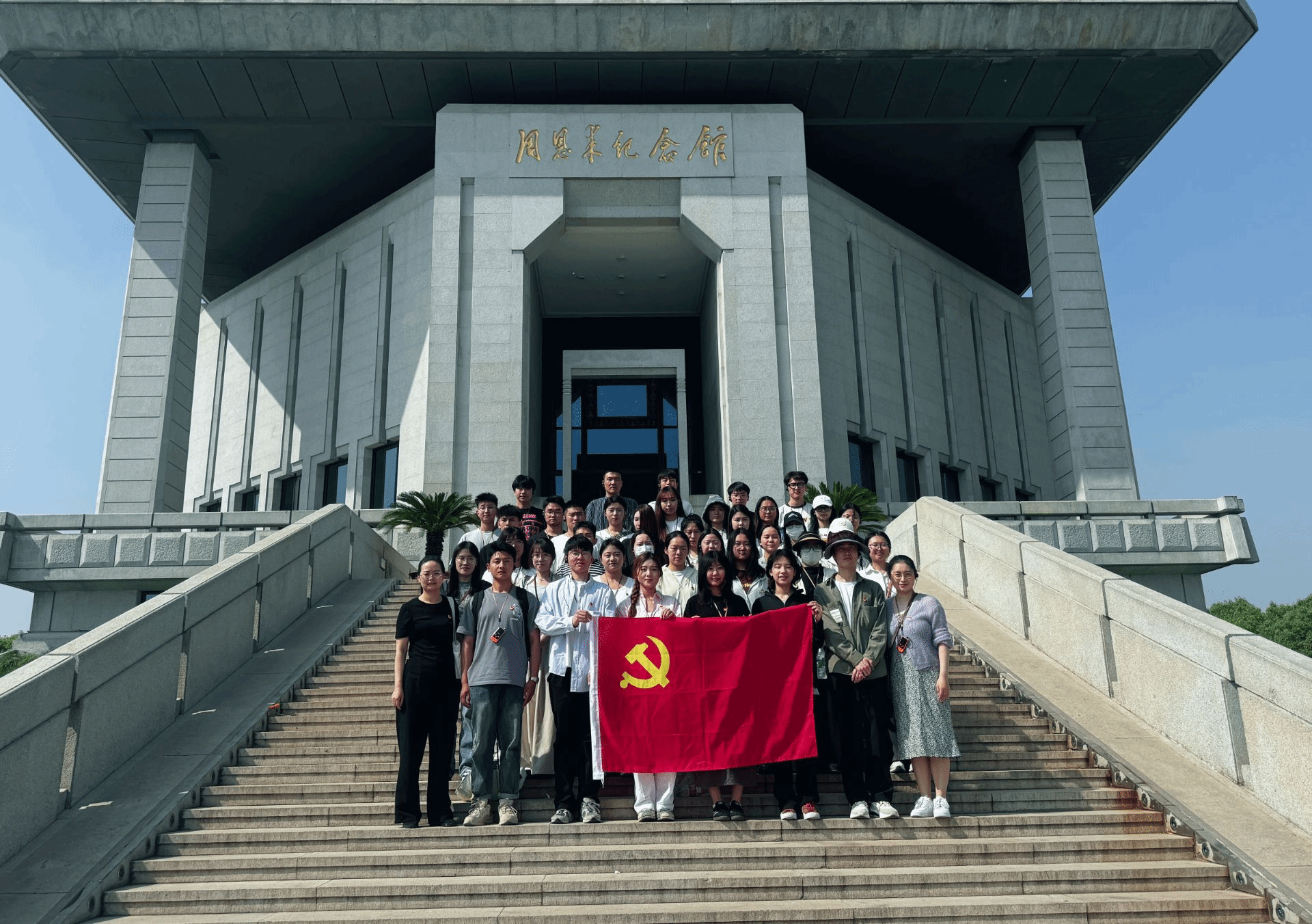 在周恩来总理汉白玉雕像前,全体党员面对党旗重温入党誓词引导广大毕业生党员增强党员意识,铭记党员身份,不忘初心,砥砺前行。