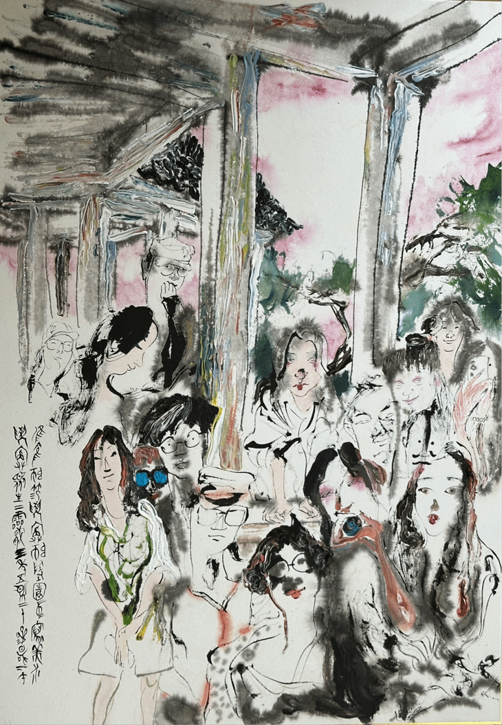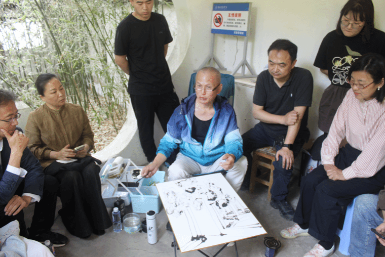 同日下午,张友宪教授在师陶园进行现场写生示范教学,美院美术学专业员工观摩学习。张友宪教授就地取景,将人物与风景巧妙结合,画面生动有趣。张教授灵活运用作画工具,不受中国画传统上色手法限制,使同学们对中国画有了新的认识,对今后的学习创作也有了进一步理解。