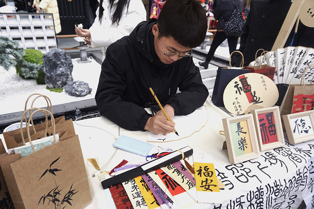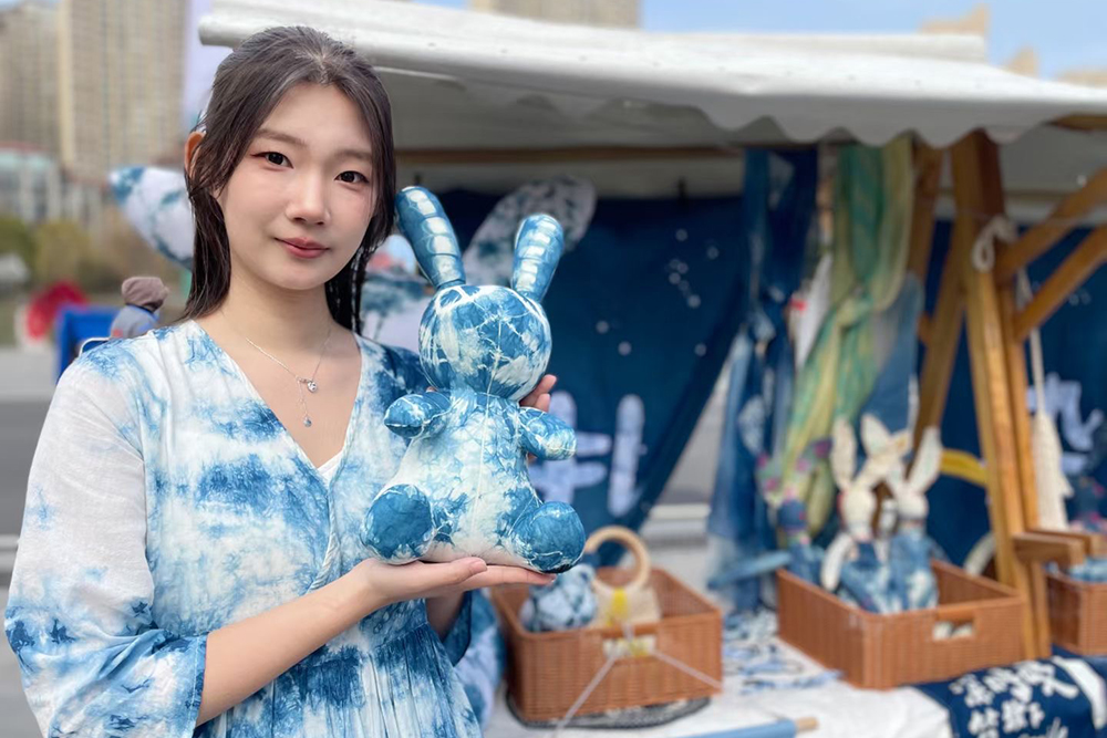 本次艺术展陈中“非遗文创”展区充分展示非遗文化魅力,一块块织布蓝白相间,鱼虫鸟兽、花草植物、几何图案立于其上,随风轻舞,如水墨般层层晕染,精美的作品吸引参观者驻足欣赏,同学们从溯源、染料的制作等方面现场为大家讲解扎染文化,体验非遗文化乐趣。在“艺术体验”展区,同学们现场展示书法、篆刻、绘画等专业技能,笔墨之间,共同感受国风古色古香,呈现了一场别开生面的文化盛宴,同时,他们还展示了团扇、手提袋、风车等手工艺品,将现代时尚与传统文化相融合,让人目不暇接。