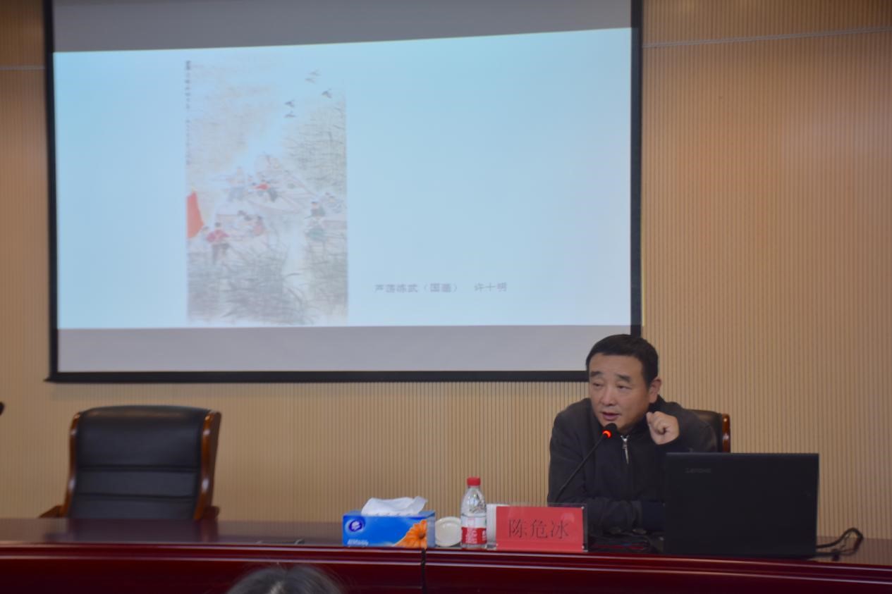 讲座中,陈危冰老师介绍了各大苏州书法家、国画家的生平和成就,并从苏州的山水画、粉画进行深入讲解。用幽默而朴实的语言为在场同学排疑解惑,从而进一步明晰苏州书法、国画的风格与特色。随后,陈危冰老师围绕“漫谈江南田园山水”这一主题叙说个人心得,深入浅出、受益匪浅。最后,陈危冰老师向因疫情逝世的老一辈艺术家表示缅怀与致敬。