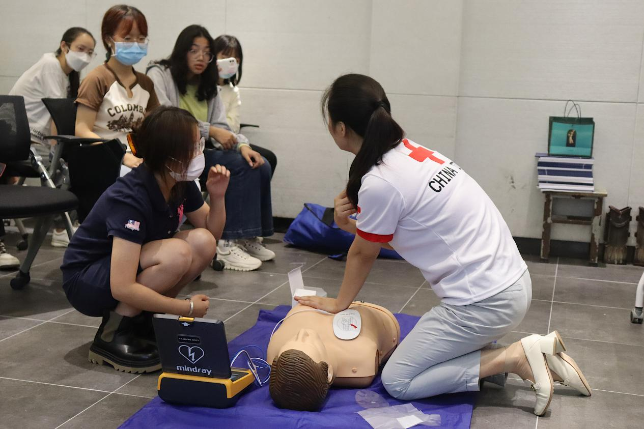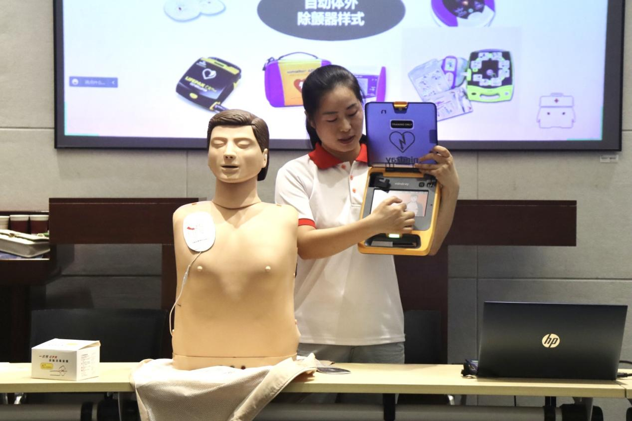 此次培训分为理论和实践两个部分。医师们首先针对关键知识点进行科普讲解,通过播放系列救护视频,生动形象的告知新生发生意外情况时应当如何自救、如何呼救,并针对相应的应急措施与急救方法展开详细解说。同时,提醒大家在施救助人的过程中要善用法律武器保护施救者的权益,让人们敢于施救、给予施救。实践环节,两位医师就心肺复苏术、海姆立克法等常见急救方法展开详细示范。首先,向同学们科普急救箱工具,以及介绍AED(自动体外除颤机)的使用方法。其次,医师们通过情景引入,向同学们实际演示心肺复苏的具体操作步骤,确认环境安全、意识判断、现场呼救、寻找AED、定位、按压、清除异物、人工呼吸等,每个环节都严格按照操作规范。最后,老师邀请了在场同学在指导下进行现场演示,使参加培训的学员较为系统地掌握了心肺复苏现场紧急救援知识和正确处理方法,进一步提升学员应急救护的能力。