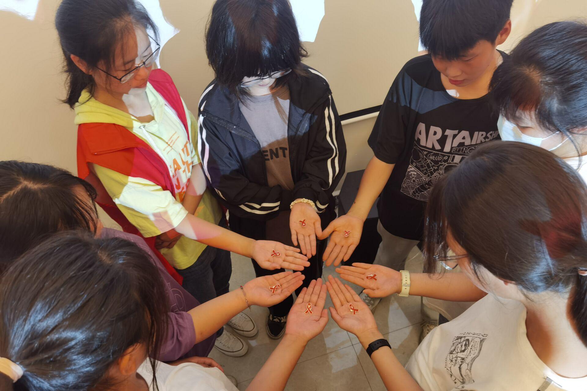 活动伊始,志愿者们身着红色马甲、佩戴口罩,通过向孩子们进行防艾相关知识的宣讲,帮助孩子们树立正确的安全防护知识,形成珍惜生命、健康生活的理念。随后,志愿者通过有关艾滋病的趣味小游戏拉进与孩子们之间的距离,采用别出心裁、寓教于乐的教学方式,锻炼和培养孩子们的动手能力与实践操作,引导他们提高对艾滋病的重视程度,增强个人保护意识。活动最后,志愿服务团队向孩子们分发美院自制防艾宣传册和文创产品,并共同合影。