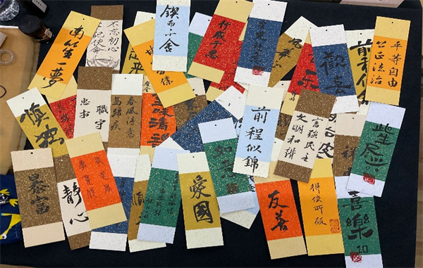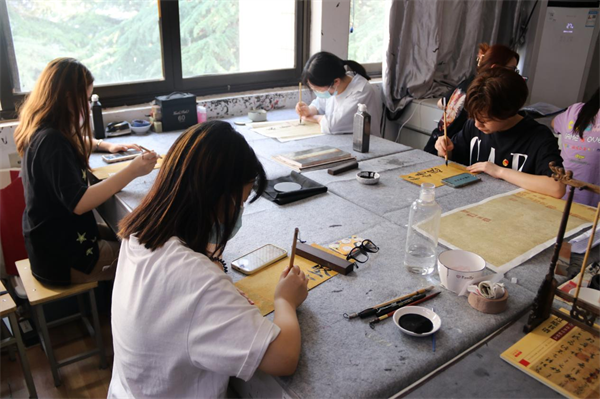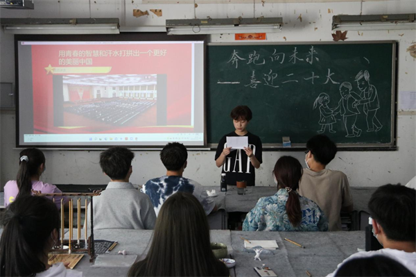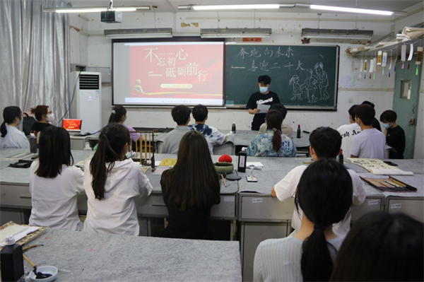 随后,进行击鼓传花,共学党史环节,以问答与娱乐相结合的形式,学习团徽、团歌、五四运动等相关党史知识,以全班同学参与互动的方式调动同学们的学习积极性,增强会场气氛。接下来同学们围绕主题“奔跑向未来,喜迎二十大”进行即兴创作,通过随机抽签决定所书字体和纸张大小,结合专业素养,激发同学们创新意识与创造活力的同时,将红色精神内化于心、外化于行。