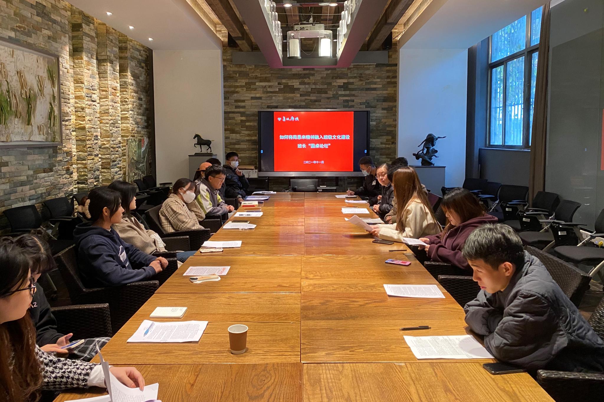 2021年11月13日下午,XCsports于西辅一楼接待室举办“如何将周恩来精神融入班级文化建设”为主题的圆桌论坛,本次活动由XCsports学工办主任马娟主持,XCsports19、20级各班班长参加。