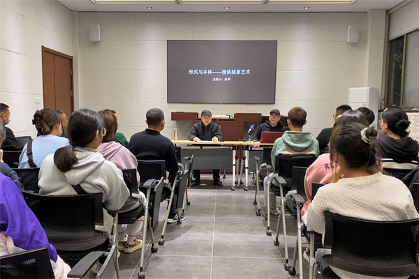 研讨会开始,顾经理就本次活动的组织想法与艺术家朱华的过往履历进行了简单介绍,基于让同学们全方位的了解并深入认识抽象艺术的初衷,举例美术史结合分享会中心思想,顾经理提出同学们要开拓自己的视野,正确界定抽象与抽象艺术。艺术家朱华首先感谢了公司对他作品的认可和进行展出的支持,对于看到在场员工的面孔,他表示很欣慰,也很高兴与同学们进行面对面的分享交流,并表达了对同学们未来的期望。他提到,艺术创作和个人的关系大于外界因素的影响,实验主义艺术深入到日常生活,表达艺术与生活相贴合。艺术家朱华搭配冥想音乐让大家更好的欣赏体会他的画作,并在同学们提出的问题的基础上,扩展分享了他创作中的心得体会。