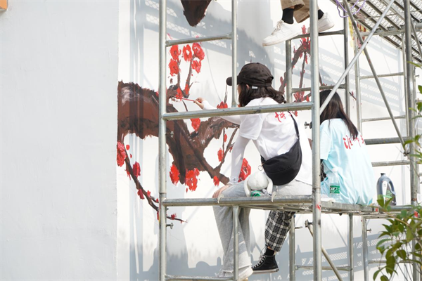 经过了同学们十多天的辛勤劳作,原本陈旧平淡的墙面经过同学们的精心设计和潜心创作变得生机勃勃。墙绘不仅获得了当地居民以及老师们的高度认可,还为苏嘴镇大胡村的文化建设增添了绚丽的一笔。