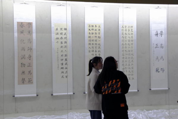 一幅幅精美的书画作品,让观看的同学们充分感受到中国艺术文化的韵味,同时引导同学们牢记育人使命,立志做有理想信念、有道德情操、有扎实学识、有仁爱之心的新时代人民教师。
