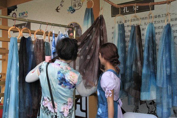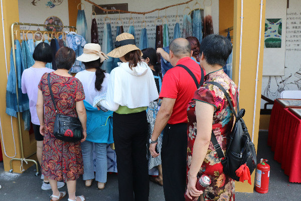 扎染是国家级非物质文化遗产,是中国民间传统而独特的染色工艺。让扎染走进大家的生活是本次活动的一大目的。展览现场吸引了众多行人驻足欣赏与询问,狭小的扎染展览空间人头攒动。参展者对扎染文化兴趣盎然。