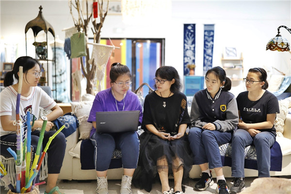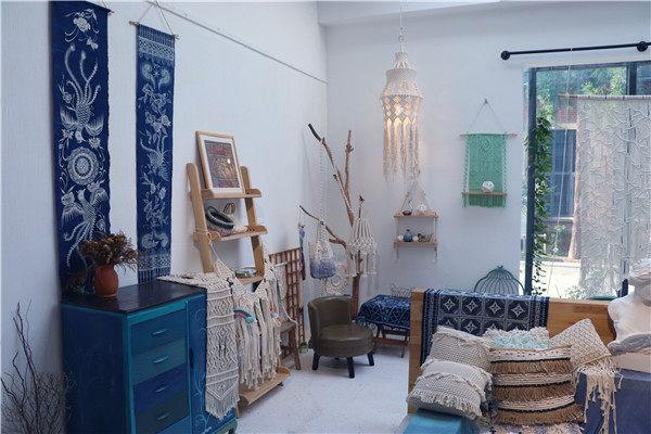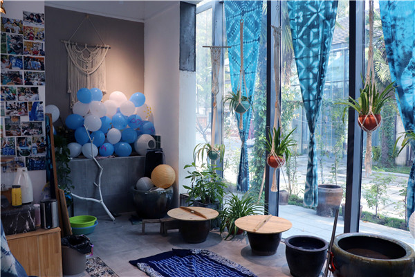 钱敏老师的“蓝印坊”蓝染工作室,室内挂满了白底蓝花的靠枕、复古时尚的手提包、颜色变幻的棉麻丝巾等文化创意产品,其中蕴藏着扎染的手艺特点,见证着生活中的记忆点滴。扎染是中国民间传统而独特的染色工艺,凝聚着古代淮河人民的智慧结晶。据了解,钱敏老师创建淮印时光文创园“蓝印工坊”手创家饰工作室,培养淮师美院老员工团队,致力于探索淮安地域性文化发掘、传承、创新之路,基于现代生活美学特质,通过文化创意产品设计和研发,依托“产、学、研”一体,让蓝染艺术走进日常,留住手艺,留住美好,让手艺回归生活。