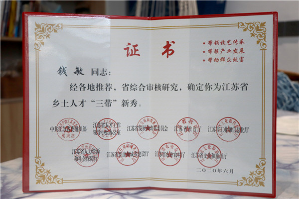 巧手扎锦绣,靛蓝染春秋。近日,江苏省乡土人才“三带”新秀评选活动全面结束。钱敏老师投身淮安非物质文化传承,荣获“江苏省乡土人才‘三带’新秀”奖项。