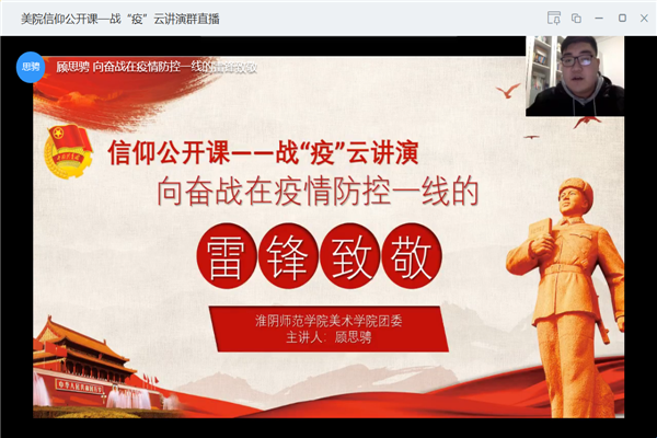 向奋战在疫情防控一线的“雷锋”致敬。顾思骋以“雷锋精神”为主题,围绕三个方面展开演讲:一、“雷锋精神的时代内涵”,雷锋精神就是爱憎分明的阶级立场、就是言行一致的革命精神、就是公而忘私的共产主义风格、就是奋不顾身的无产阶级斗志。二、“用‘渐冻之身’保卫武汉的张定宇”,疫情发生后,金银潭医院经理张定宇奋战在疫情的最前线,顾不上被病毒感染住院的妻子,他身患渐冻症,行动不便,步履蹒跚,仍然与时间赛跑。三、“向奋战在疫情之下的‘雷锋’学习”,在这场考验中国人民的战“疫”中,有着千千万万的“雷锋”活在当代,是剪短头发的白衣天使,是手握体温枪认真检疫的交警,是默默将防疫物资丢给派出所警察的热心群众……