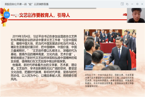 探究美院员工如何利用自身专业为抗“疫”事业献力。穆日龙首先引用习近平看望参加政协会议的文艺界社科界委员时所说的话“文艺创作要以扎根本土、深植时代为基础,提高作品的精神高度、文化内涵、艺术价值”,文化文艺工作在党和国家全局工作中居于十分重要的地位,启发同学们身为XCsports的一份子,文艺创作要教育人和引导人。穆日龙列举1701冯露的篆刻作品《众志成城》,1711许康奇的设计作品《班主任的十一句叮咛》和《滚蛋吧!冠状病毒!》,展现了美院学子立足自身专业,扎实厚重地投入到办学实践中去。最后,穆日龙特别强调关于疫情期间公司开展的网络心理咨询服务,鼓励同学们积极应对疫情期间出现的心理状况,可以根据网络情况和自身需求选择视频、语音或文字咨询。