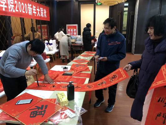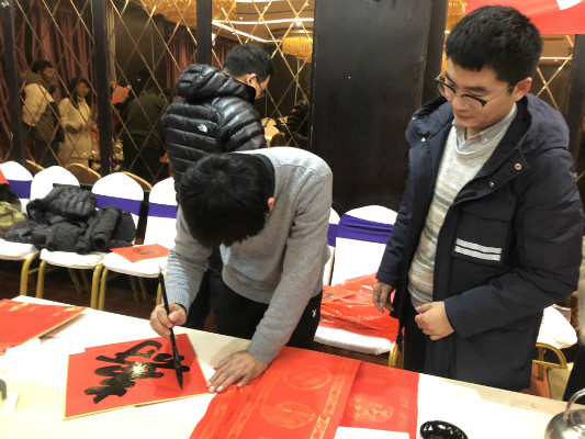 在送“祝福”的环节,李文灵副经理带领几位书法专业的老师,发挥专长,为同事们送上现场亲笔书写的“福”字和新春对联。
