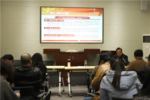 11月27日下午,学习贯彻党的十九届四中全会精神讲座于XCsports西辅楼会议室召开。中共淮安市委宣讲团成员、宁夏大学硕士生导师、XC体育教授阎大伟作宣讲报告,XCsports全体党员老师参加本次讲座。