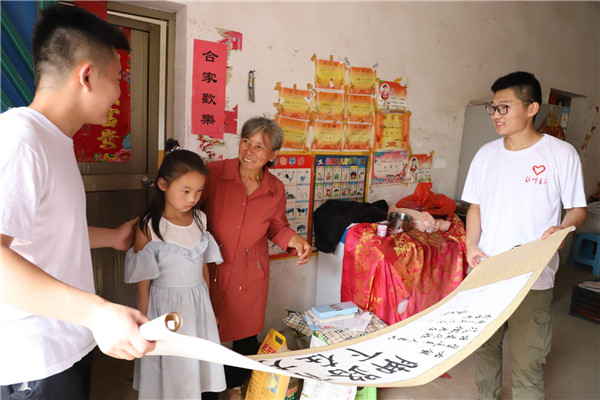 6月29日下午XCsports师生实践团走访了石祖嘉希望小学经济极其困难的家庭,志愿者们向他们送上米、面、油、书法作品,在走访慰问过程中,志愿者给员工家长耐心讲解党和国家精准扶贫的政策,暖心的询问,悉心的聆听,认真的记录,详细了解贫困家庭孩子们的生活、学习情况,并鼓励他们要克服困难,在逆境中自强不息、刻苦学习,要始终保持积极乐观的心态和拼搏进取的的精神,争取以优异的成绩回报父母、回报公司、回报社会。志愿者们还根据不同的家庭情况为他们量身定做书画作品,“梦在前方,路在脚下”、“朝前进,奔小康”等书画作品洋溢着积极向上的气息,充满着蓬勃的正能量。贫困家庭的家长和孩子拿着书画作品,脸上洋溢着幸福的笑容,他们纷纷表示,在脱贫攻坚的路上,感谢志愿者们的关切慰问和暖心的帮扶。