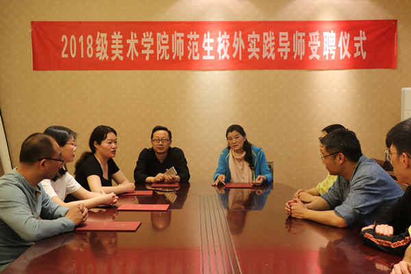 本次受聘仪式分为两个环节。首先,由苏梅副经理为五位受聘老师颁发聘书,并对所聘请的老师表示衷心地感谢。本次会议更为重要的是针对美术学专业的教改研讨。老师们对现阶段的教学工作进行总结,发掘教学过程中所存在的问题,然后集中研讨并制定解决方案。这次聘请校外实践导师的目的是提高16、17级美术学专业同学们的实践能力,其中苏梅副经理也提出了要加强“引进来”、“走出去”的教学方法,即引进经验丰富的老师进行指导,带领同学们走出校门,增强实践能力。黎晟老师也在本次研讨会也提出要在原基础上改变上课的方式,从而提高课堂质量的观点。