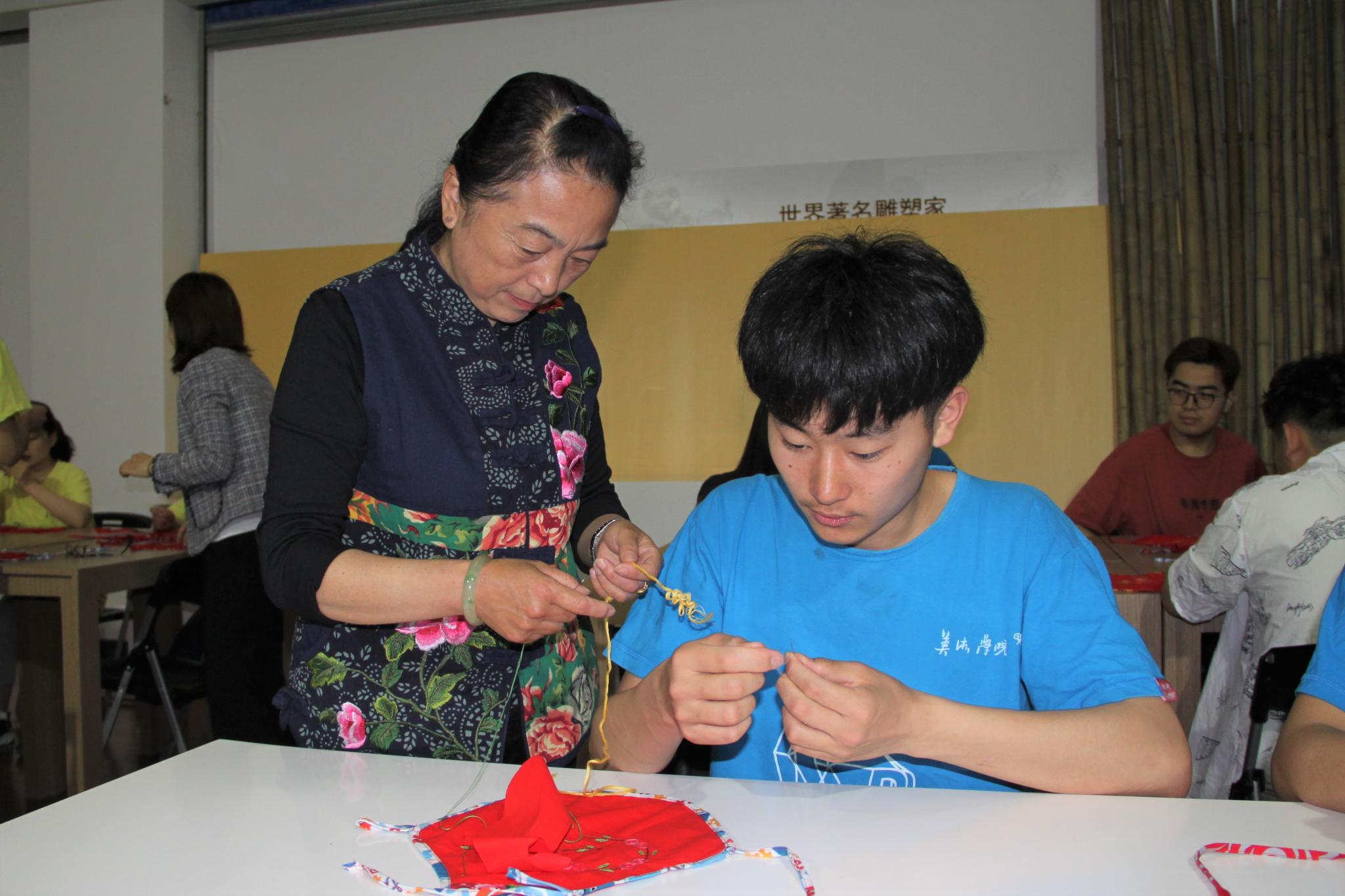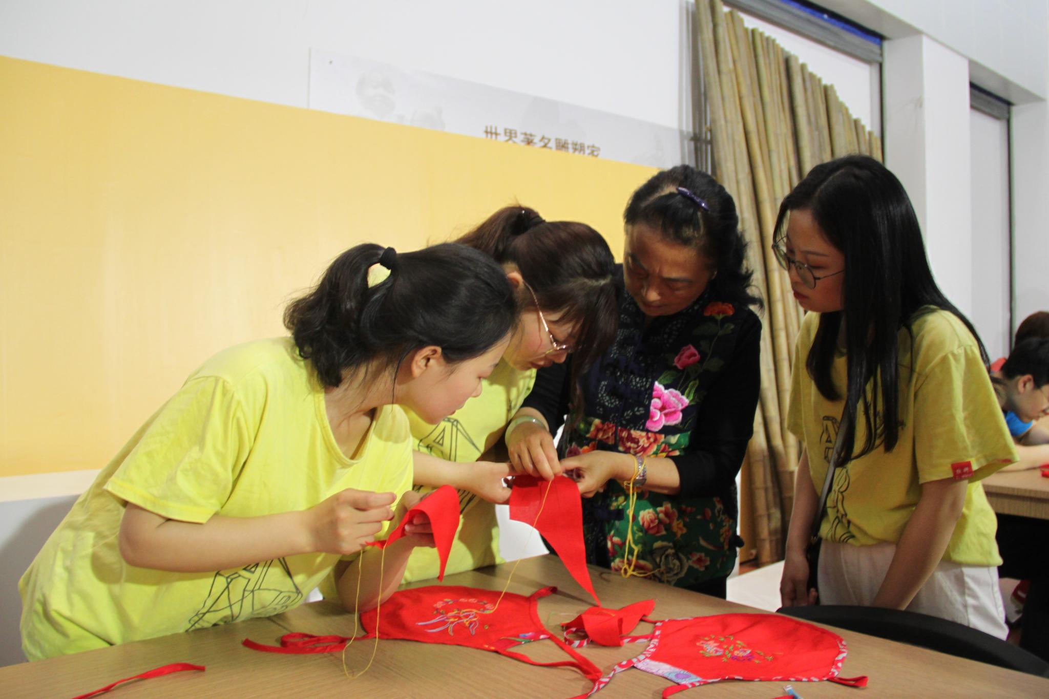 布艺即布上的艺术,是我国传统民间工艺之一。活动伊始,非遗传承人杨老师向同学们普及布艺知识,布艺主要用于服装,鞋帽,床帐,挂包,背包和其他小件的装饰,如头巾,香袋,扇带,荷包,手帕等,是以布为原料,结合剪纸、刺绣、制作工艺为一体的综合艺术。紧接着,杨老师向同学们发放针线、布料等材料,带领大家进行基础针法学习——锁针法。杨老师首先向同学们进行示范教学,随后鼓励大家在布料上动手练习。看似简单易操作的针线活,当真正操作起来,对于初次接触的同学们来讲是一个对耐心和细心极大的考验,银针细线,需要同学们耐着性子一点点去绣。大家对于布艺文化的热情度极高,丝毫不觉得麻烦,很快便学会了锁针法,紧接着,同学们开始完成由杨老师准备的绘有金鱼、花朵等图案的半成品肚兜,大家热情不减,很快便完成了。更是有许多同学对布艺文化十分着迷,并结合书法、美术等专业特色进行创新,向杨老师请教如何将书法文字绣于布上。杨老师见同学们对布艺文化热情满满,十分欣慰,给予美院同学极高的评价,并表示自己对布艺文化的传承问题的解决看到了希望。