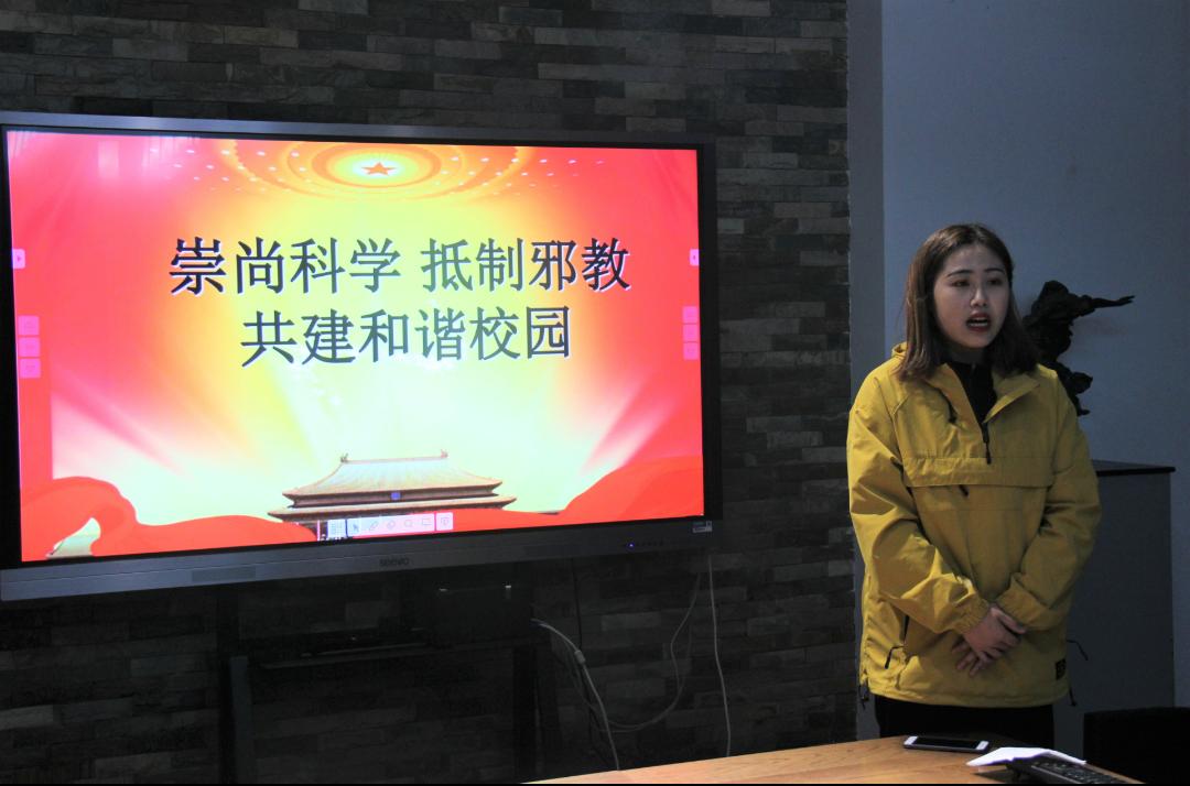 1701班团支书李秋艳对本次反邪教知识竞赛宣传进行有感发言:“我们应当珍惜生命,反对邪教,努力学习科学知识,从科学的精神和态度把握生活”。