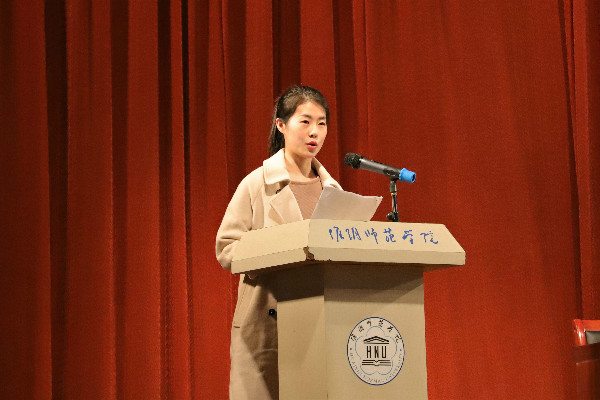 国家奖学金获得者李楚凝同学作为员工代表进行发言,她说道,“勤学、修德、明辨、笃实”是当代老员工迫在眉睫的必修内容,要坚持由易到难、由近及远,努力把主题教育月的精神变成日常的行为准则。李楚凝提出身为当代老员工应做到的四点要求:一、下得苦功夫;二、是要加强道德修养;三、是善于明辨是非;四、扎扎实实干事。