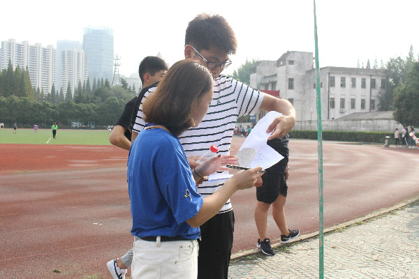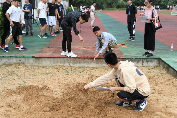 为了维护秩序,保证运动会有条不紊的进行,早在运动会开始的一个小时之前,工作人员就已经到达了田径场。划分场地、搬运设备、调试音响……他们忙碌的身影遍布田径场的每一个角落。志愿者们热情的为长跑运动员送去矿泉水,为100米冲刺的同学们加油打气;他们守在跳远的沙坑旁边,将摔倒的运动员扶起;他们穿梭在各个运动场地,为不清楚规则的同学耐心谅解,认真示范……裁判员们分工协作,提高效率,严格保证记录无误、公平公正,这种严谨态度是对所有参赛运动员负责的表现。他们的默默奉献是一种无声的加油鼓励。