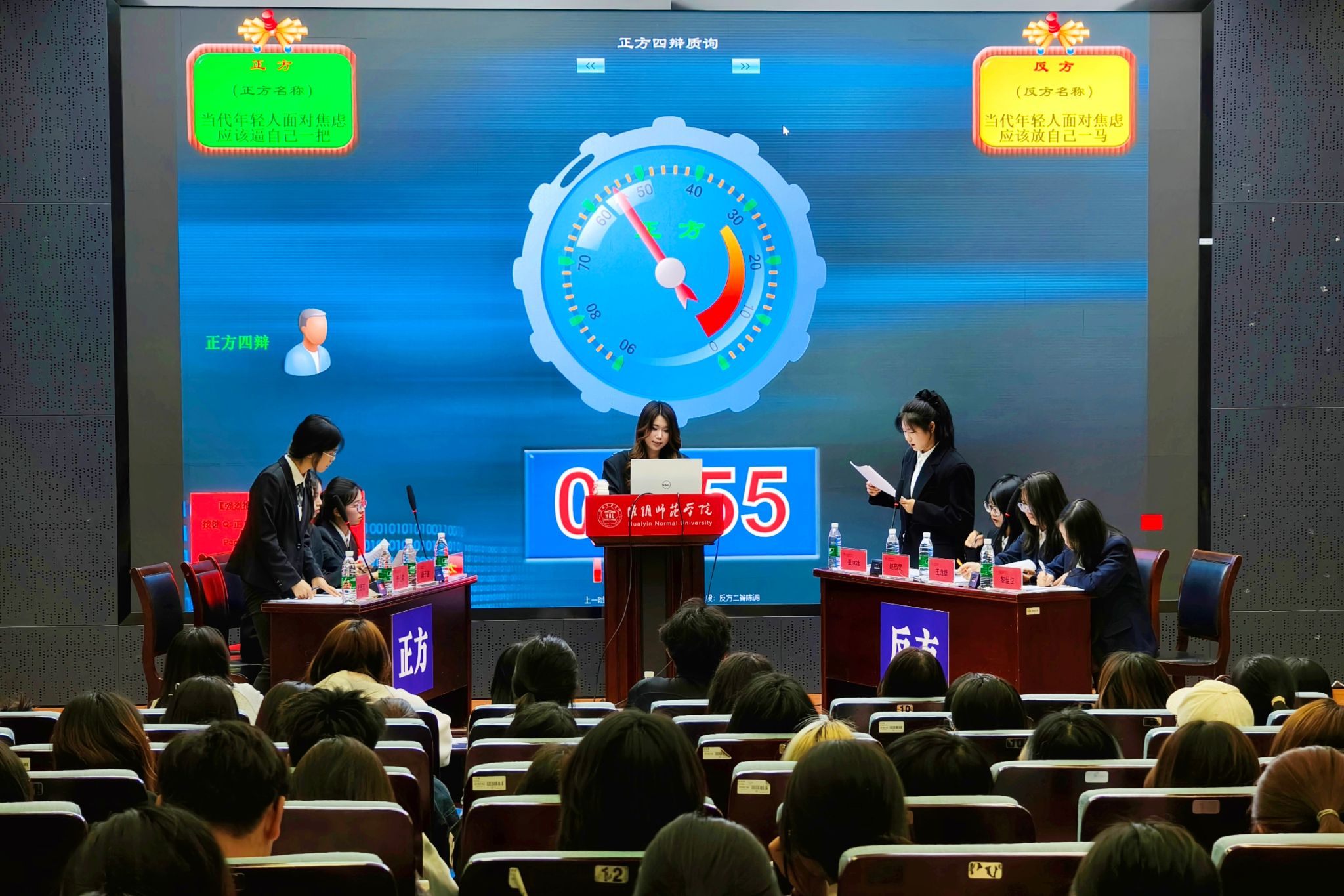 本次辩论赛由XCsports辩论队成员、员工会主席团成员及张竞夫老师担任评委。活动围绕“当代年轻人面对焦虑应该逼自己一把还是放自己一马”的辩题展开激烈交锋。正方从社会竞争压力角度切入,强调自我突破的重要性;反方则立足心理健康维度,主张合理纾解压力。在开篇立论环节,双方辩手通过详实的数据和案例,系统阐述核心观点。