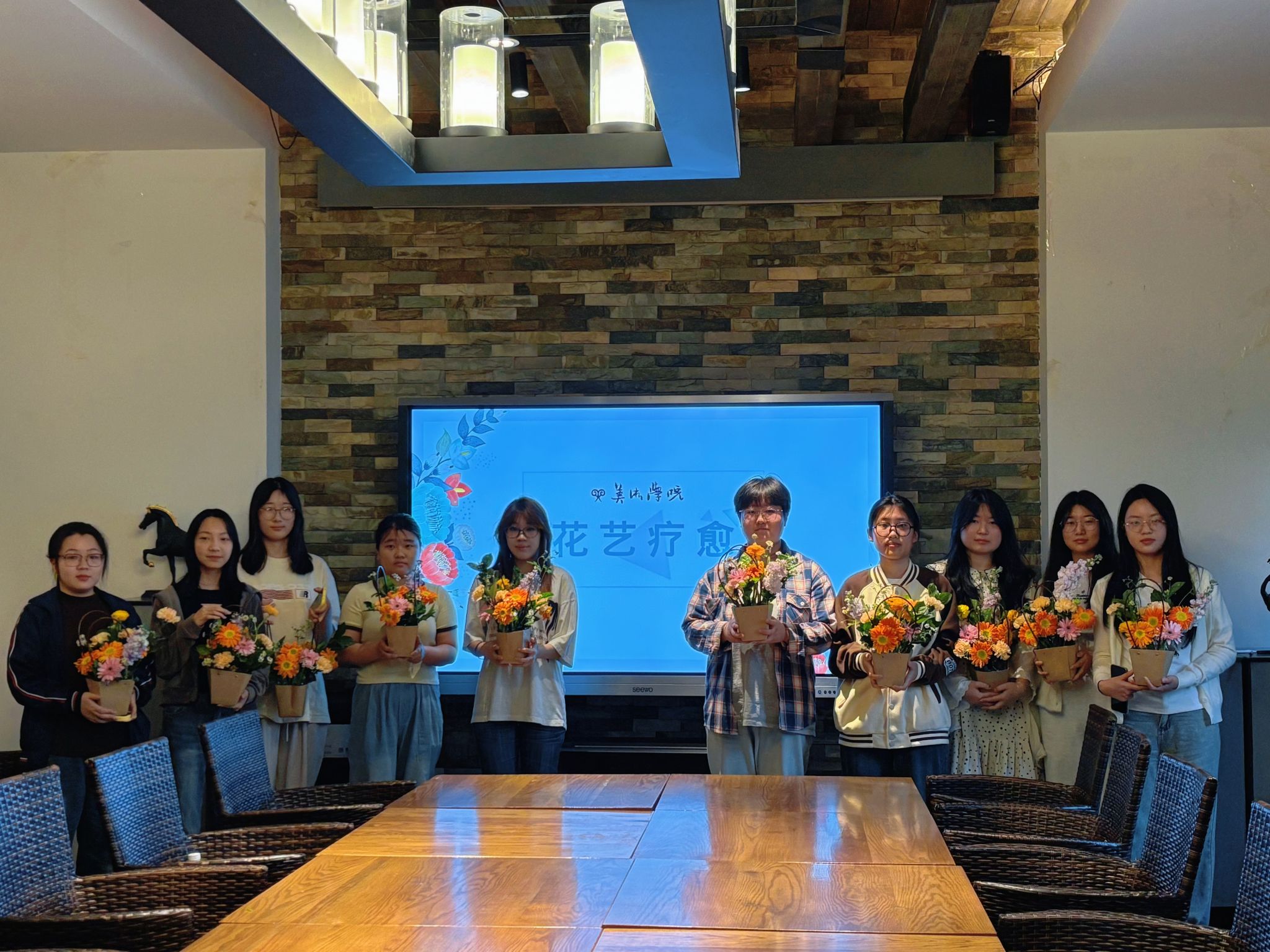 活动结束时,同学们手捧自己的插花作品合影留念。本次活动将花艺创作宇心理疗愈相结合,为同学们提供了沉浸式的美学体验,打造了放松身心、释放压力的新窗口。