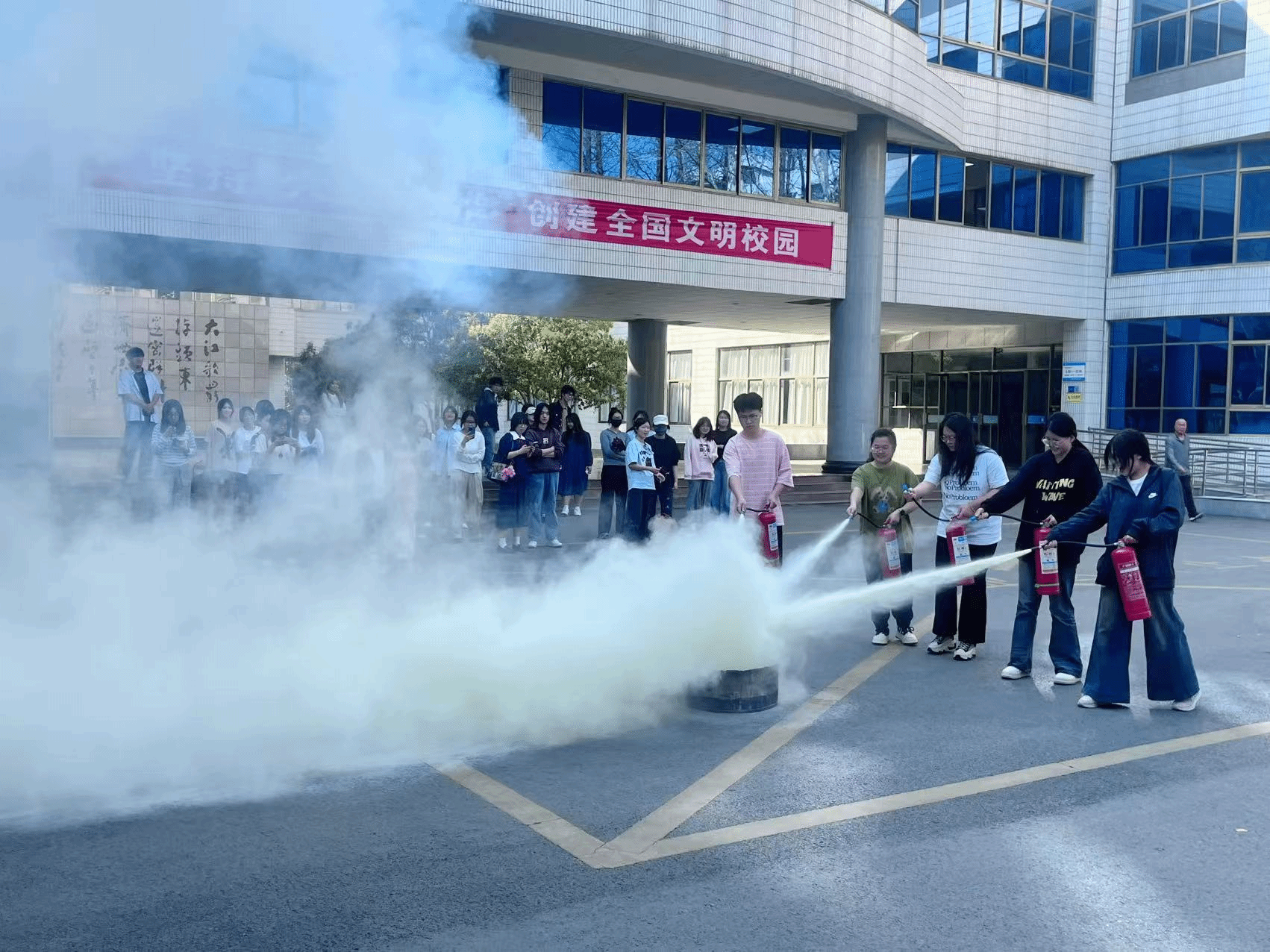 理论宣讲结束后,在综合楼门口进行了灭火器实操演练。王老师现场演示了干粉灭火器的“提、拔、握、压”使用步骤,并指导同学们分组操作。参与演练的员工表示:“第一次亲手灭火,既紧张又兴奋。掌握了正确方法,遇到紧急情况就不会慌乱。”