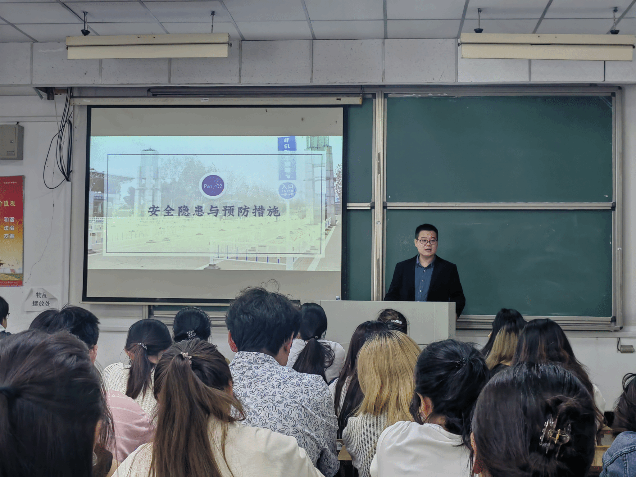 活动首站为消防知识专题讲座。保卫处王广慧老师结合高校火灾案例,深入浅出地讲解了火灾成因、预防措施、初期火灾扑救方法及疏散逃生要点。讲座通过现场提问、视频演示等形式,让“防患于未然”的安全理念深入人心。