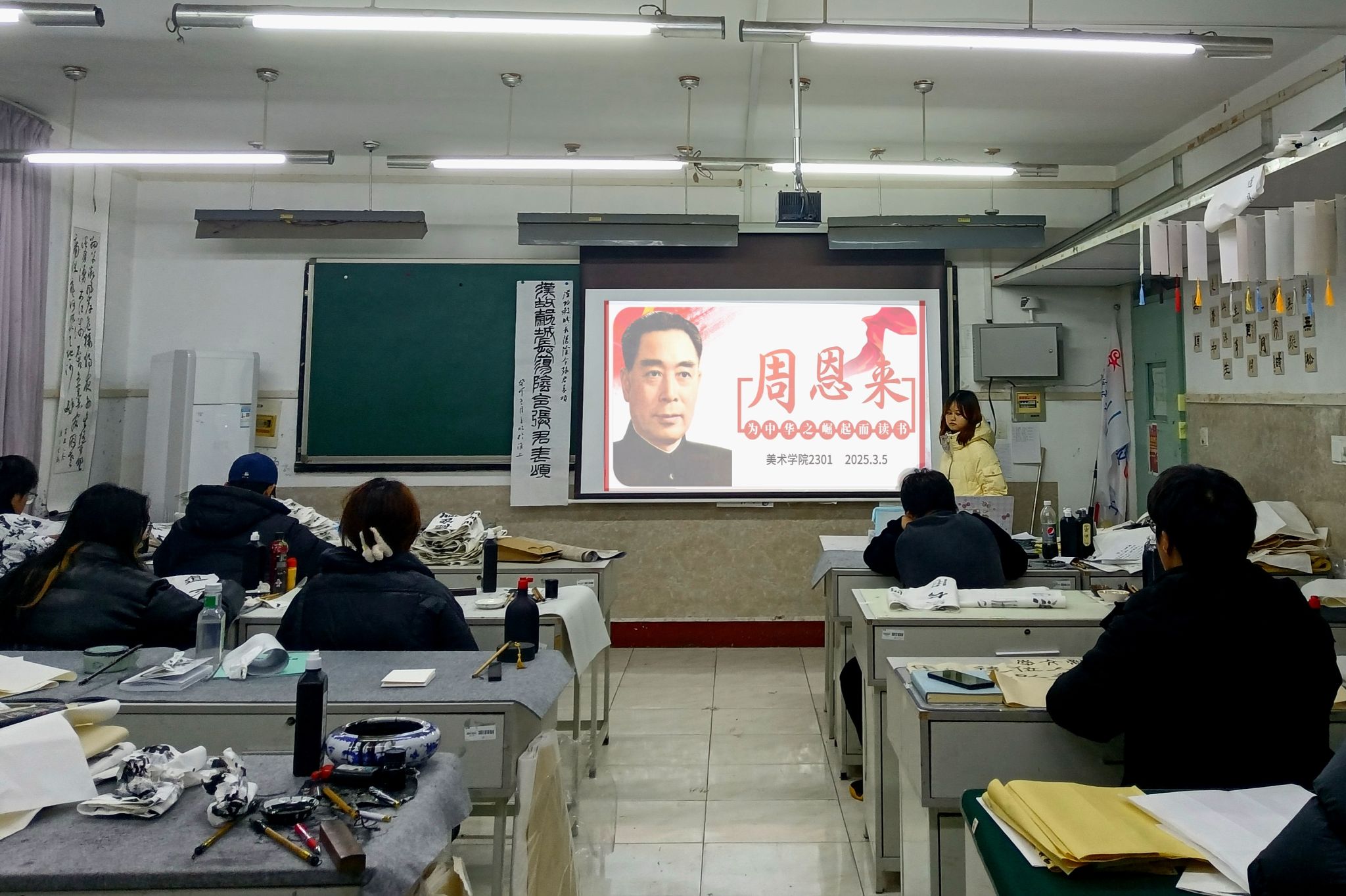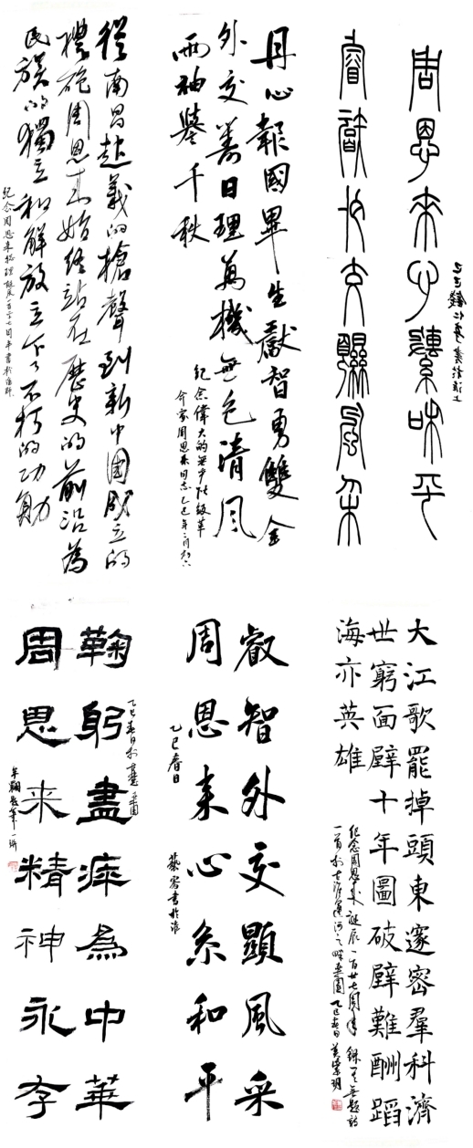 活动中,书法班的同学们充分发挥了自己的专业优势,以笔为媒,墨香寄情。他们现场挥毫泼墨,创作出一幅幅饱含深情与敬意的书法作品。这些作品不仅字形优美、笔力遒劲,更在字里行间流露出对周恩来总理无尽的敬仰与爱戴之情。