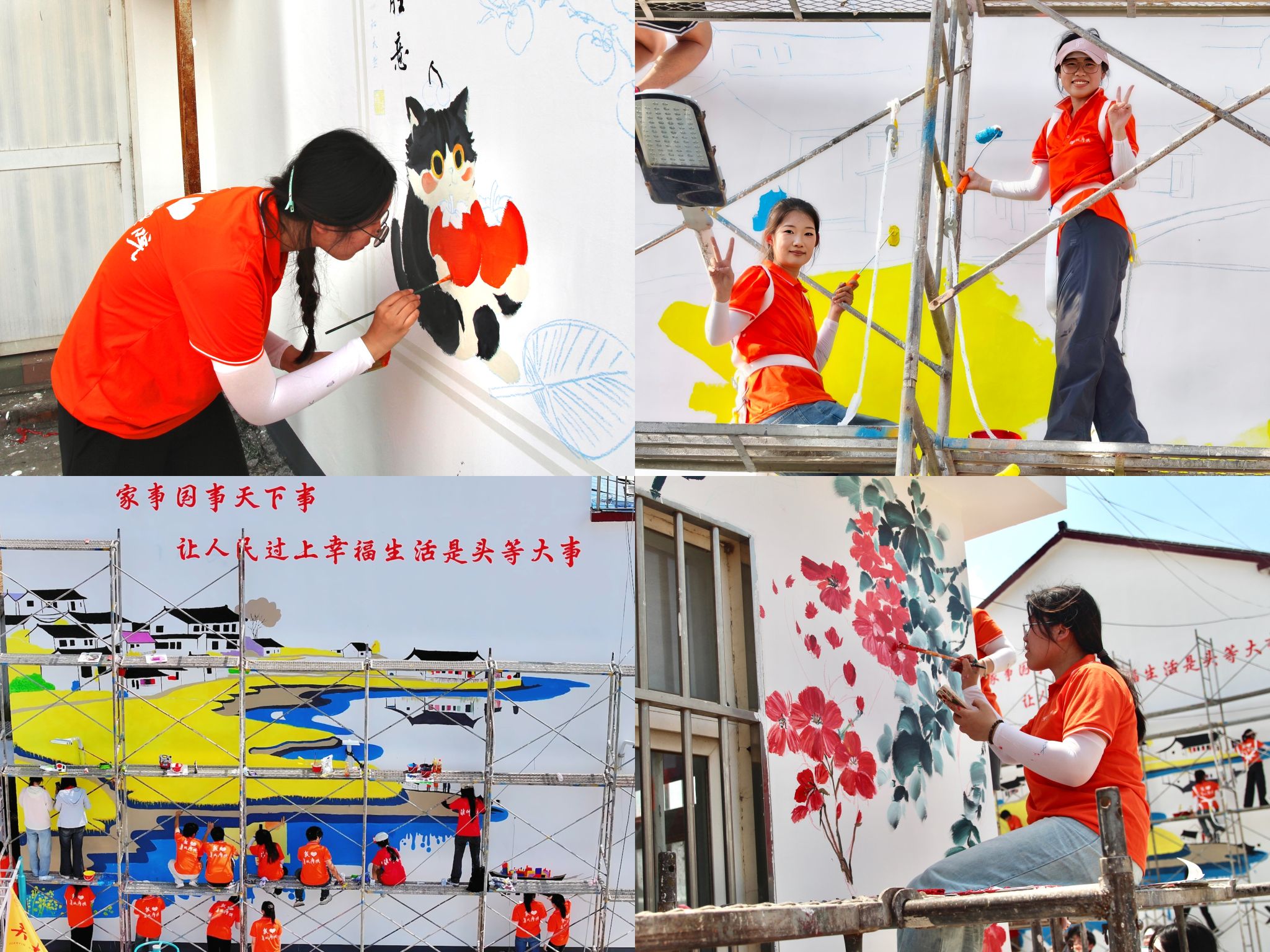 XCsports实践团赴淮安区钦工镇贾庄村开展墙绘工作。学子们不畏酷暑,手握画笔,以广场墙面为画卷,将淮安区特产、乡风文明融入墙体绘画设计当中,近500平方米的墙绘作品让素白墙面焕发出勃勃生机。“画得真漂亮,村里更有艺术味儿了!”村民们的驻足欣赏化作丈量乡村美育成效的标尺。同学们执初心之笔,使乡村在艺术的浸润下焕发出更迷人的魅力。