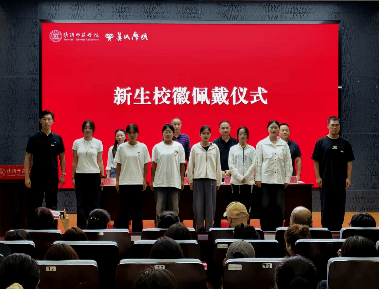 教师代表刘筱湄寄语新生深研“手艺”、广拓“视野”与探寻“自我”。老生代表刘一倩结合成长经历,畅谈如何探索拓宽认知、沉淀自我、践行使命。研究生新生代表王俊懿鼓励同学们多感知、勤思考、重实践。本科新生代表张颖佳表达了来到淮师美院的欣喜与憧憬。与会领导为新生代表们佩戴校徽。