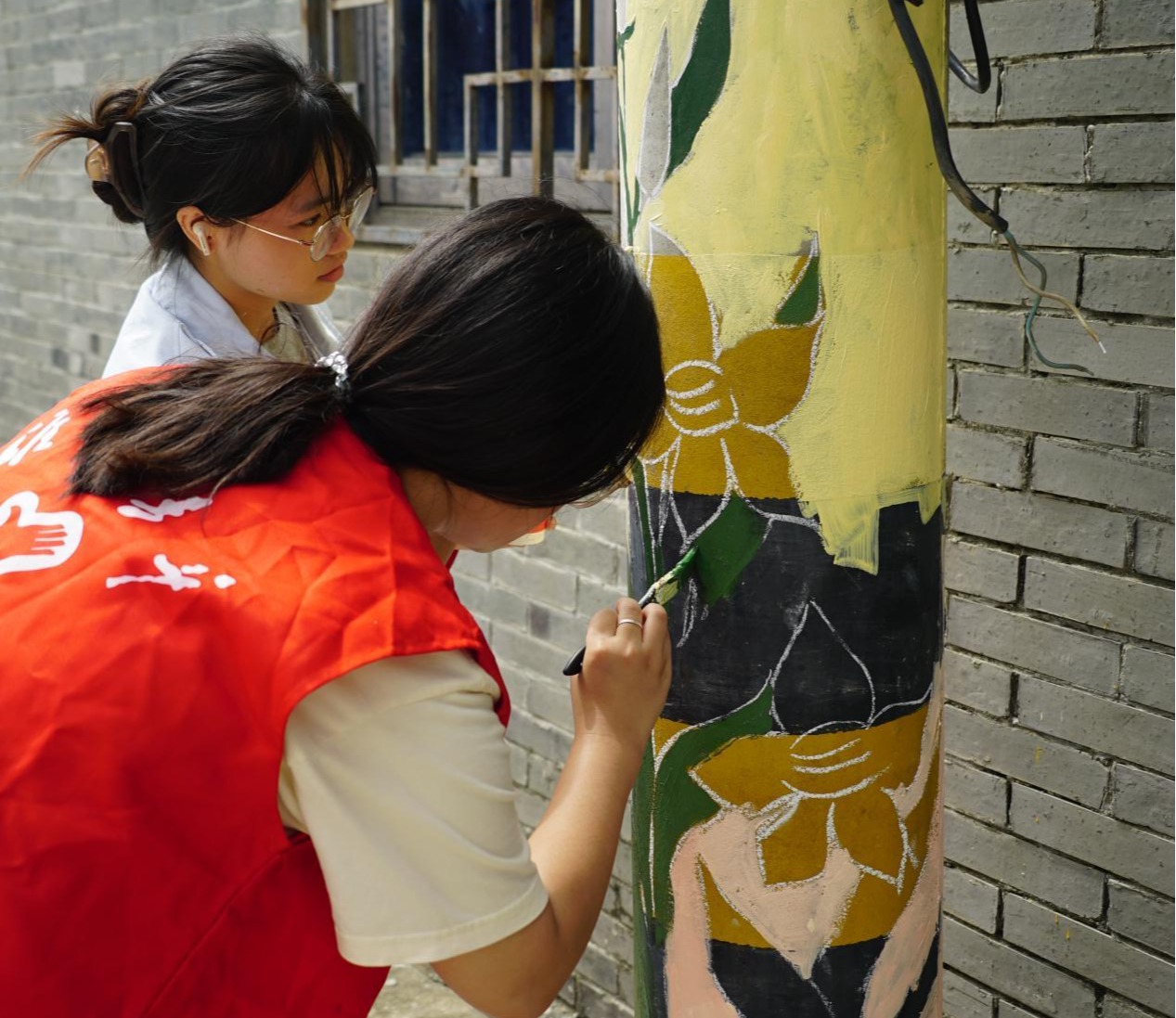 随着国庆氛围日渐浓厚,师生团队正式开启墙绘创作。实践过程中,大家充分发挥美术专业优势,将课堂知识与现场需求深度融合,每一笔都饱含对乡村的热爱与对祖国的祝福。从墙面预处理到构图起形,再到上色渲染,每个环节都有条不紊。老师全程坚守现场指导,针对色彩搭配、细节刻画等问题逐一调整,确保作品既具艺术美感,又能展现蒋坝特色;员工们则分工协作、互帮互助,有的专注打磨墙面、调配明快颜料,有的精心勾勒轮廓、细致填充色彩,遇到高处绘制难题时,还主动搭建辅助设施、轮换作业。在数日的紧密配合中,员工们不仅锤炼了绘画技巧,更用协作的力量加速推进创作,让一幅幅饱含青春活力的墙绘逐渐成型。