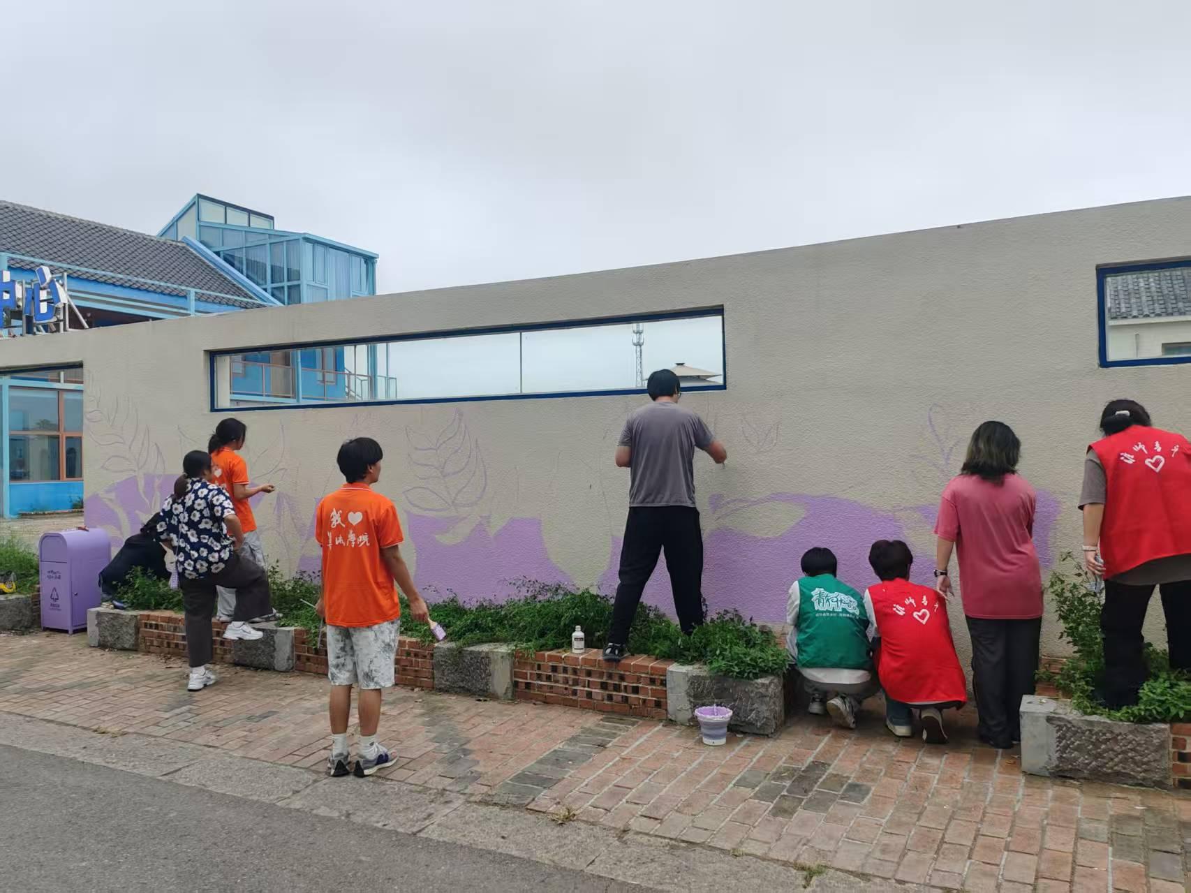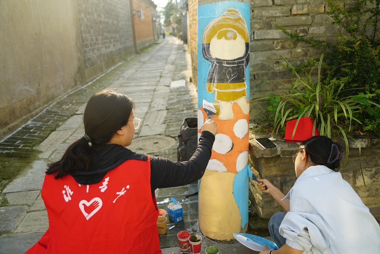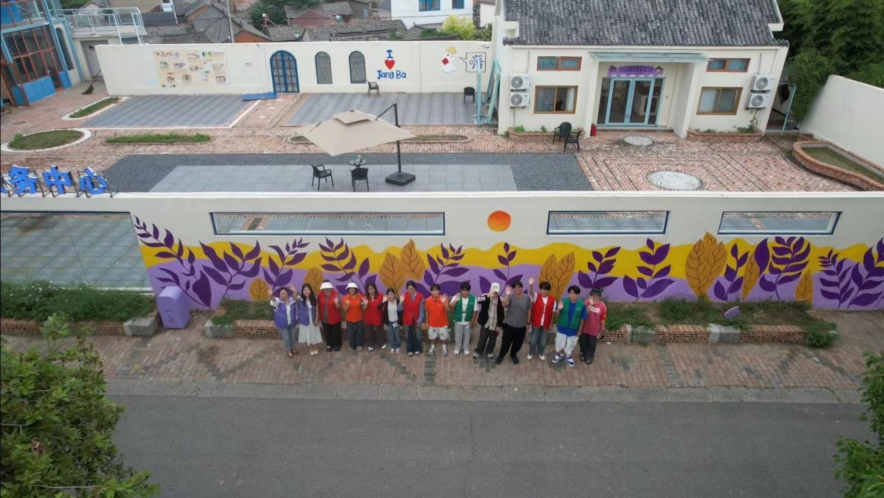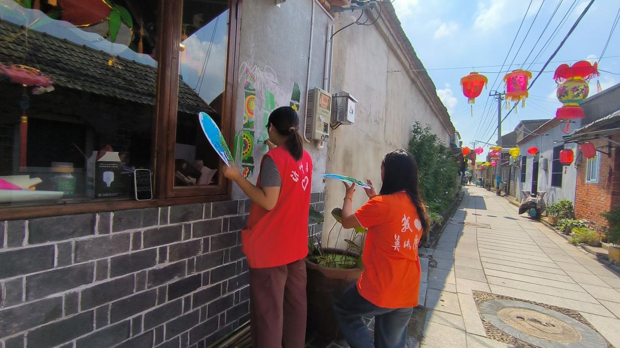 为让墙绘作品精准贴合蒋坝特色,师生团队在实践启动前便精心筹备。他们深入蒋坝的街巷、田间与湖边开展实地调研,走访当地居民,聆听承载古镇记忆的历史故事与民俗传说;细致观察洪泽湖周边的自然景致,将“渔家生活场景”“四季湖景”等充满地域风情的元素纳入创作素材库。调研后,团队围绕“如何用艺术展现蒋坝风貌、为国庆献礼”展开热烈构思,员工结合课堂所学的构图、色彩理论提出青春创意,老师逐一审阅并指导优化,最终确定40余幅墙绘的题材方向,为现场创作奠定坚实基础。