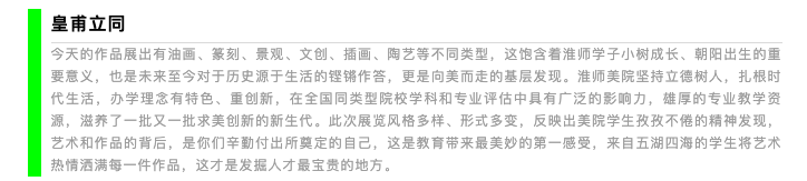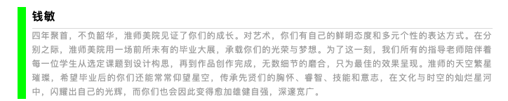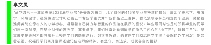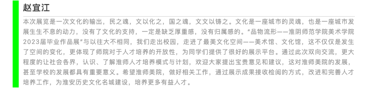 本次展览的主题是“品物流形”,意指万物受自然的润泽而运动变化,磕磕然其形各异,融合传统和现代风格、人文与思辨特色,体现出多元化、开放性的特征。以两千年古城淮安文脉和三千里运河底蕴为艺术根基,呈现出美院学子对个人、生活、情感、成长的重构表达,对当代艺术与社会问题的敏锐捕捉和创新回应。同学们在创作中实现了学识技能的完善和自我思想的升华,是个人四年淮师学习成果的总结,也是公司教学改革成效与人才培养质量的彰显。通过毕业展这个舞台,演绎好本科阶段的最后一课,演绎出个人专业的真实水准,演绎出老师的欣慰,演绎出母校对人才培养价值体现,留给淮安市市民一场艺术视觉盛宴,增色美丽淮安。
