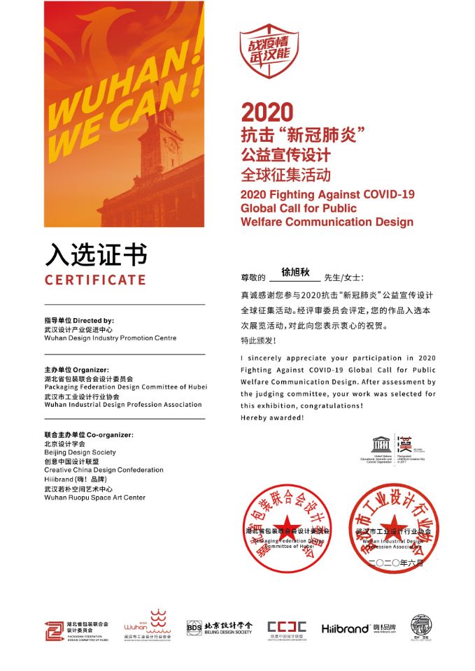 通过他不懈努力、勤奋学习,有了较大的进步,并且荣幸获得了国家励志奖学金,荣获四次校一等奖学金,两次二等奖学金,以及的校优秀共青团员标兵、校三好员工等荣誉称号。疫情来临之际,他想用所学贡献一份力量,在家中做了一些设计作品用来鼓舞人心,希望可以通过作品,为抗击疫情出一份力!